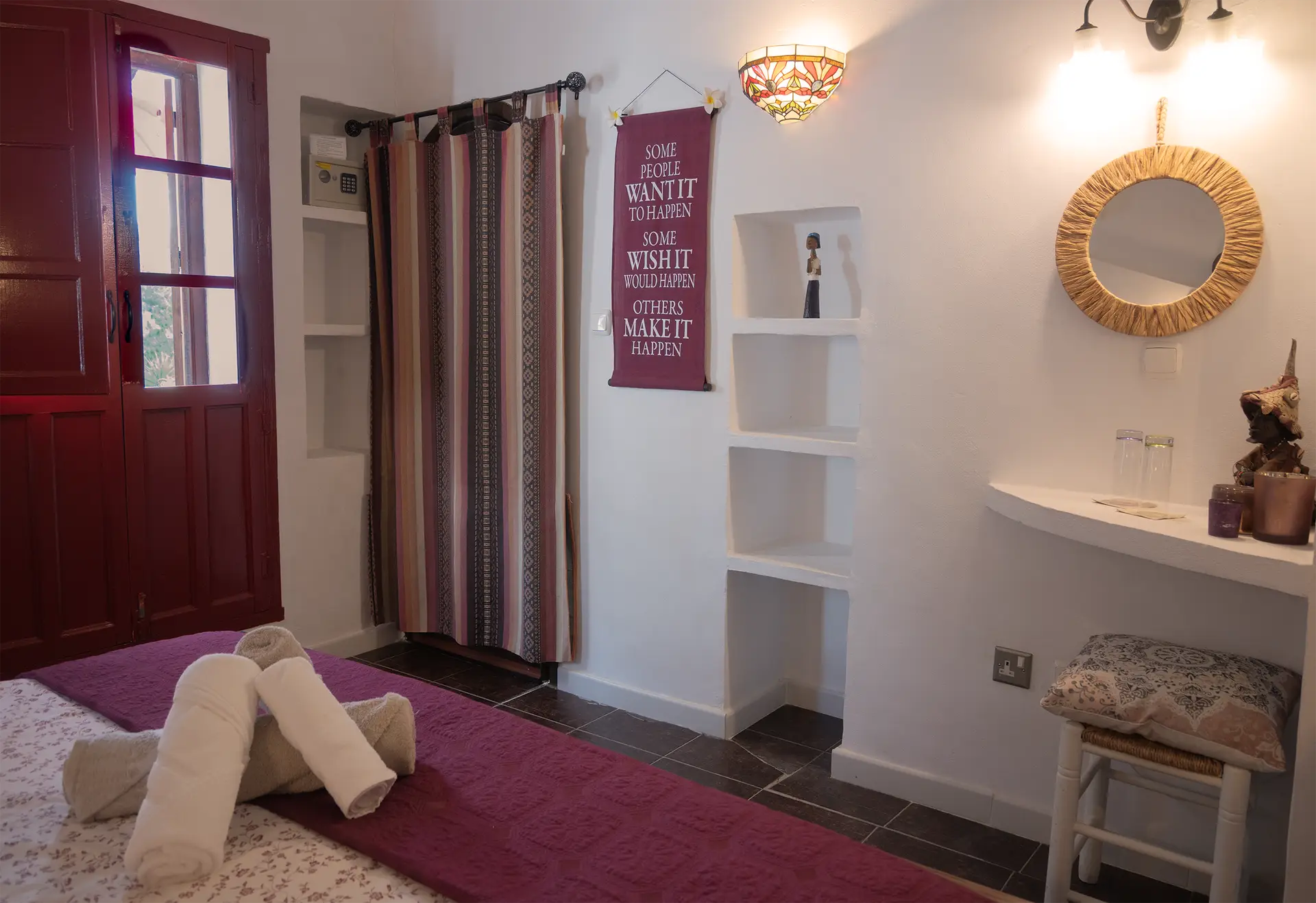 Kamer Almendra is een knusse kamer met eigen douche, toilet en lavabo. Ze is gelegen aan het gezamenlijk terras, met eigen ingang. De kamer beschikt over een 2-persoonsbed, haardroger, kluisje en badjassen, alsook bad-en zwembadhanddoeken.